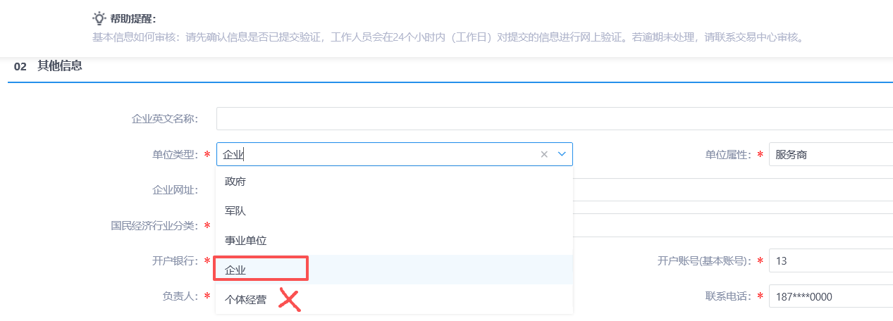 单位类型修改为企业,请勿选择个体经营不然无法购买保函